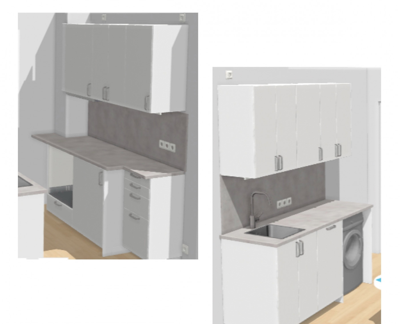 * neue Einbauküche mit weißen Fronten, hellgrauer Arbeitsplatte-und Rückwand, Backofen, Ceranfeld, Geschirrspülmaschine, Kühl-Gefrierschrank