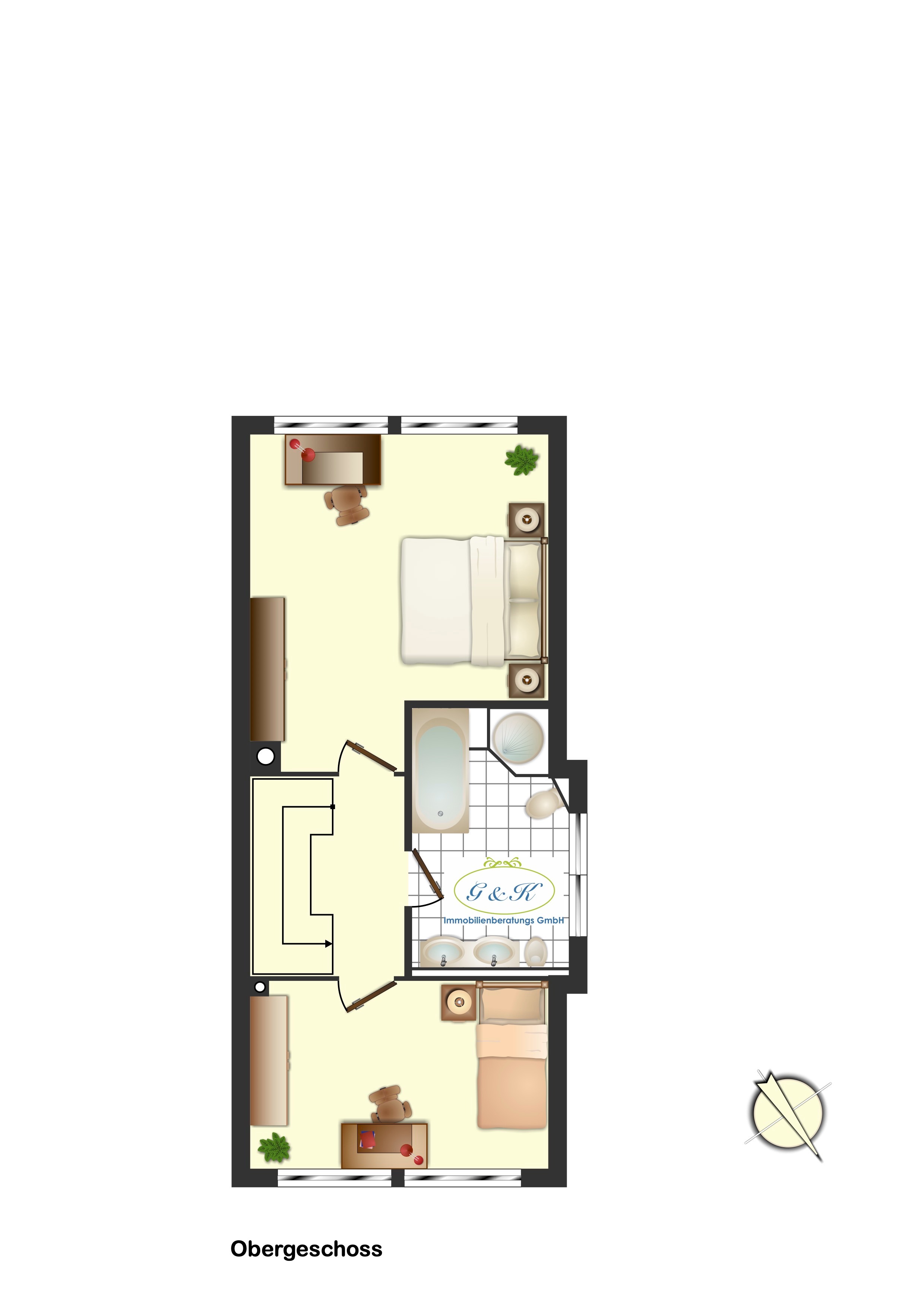 Im Obergeschoss befindet sich ein großzügiges Tageslicht-Dusch-Wannenbad mit Doppelwaschbecken und Bidet und Fußbodenheizung. Außerdem sind in dieser Etage 2 Schlafzimmer untergebracht.