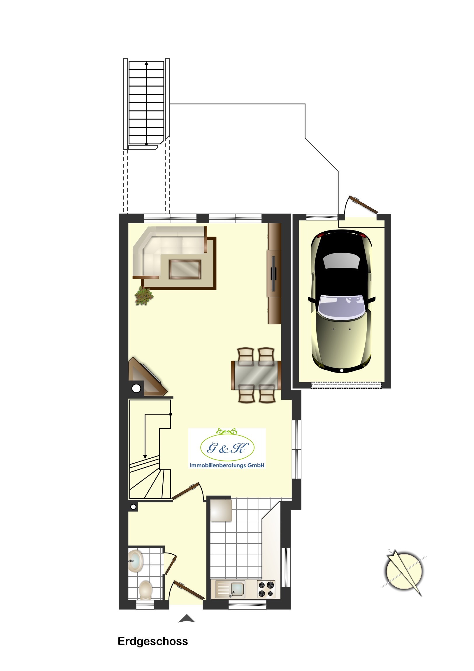 Im Erdgeschoss schweift Ihr Blick vom großen Wohnbereich mit offener Küche direkt zum idyllischen, kleinen Garten.