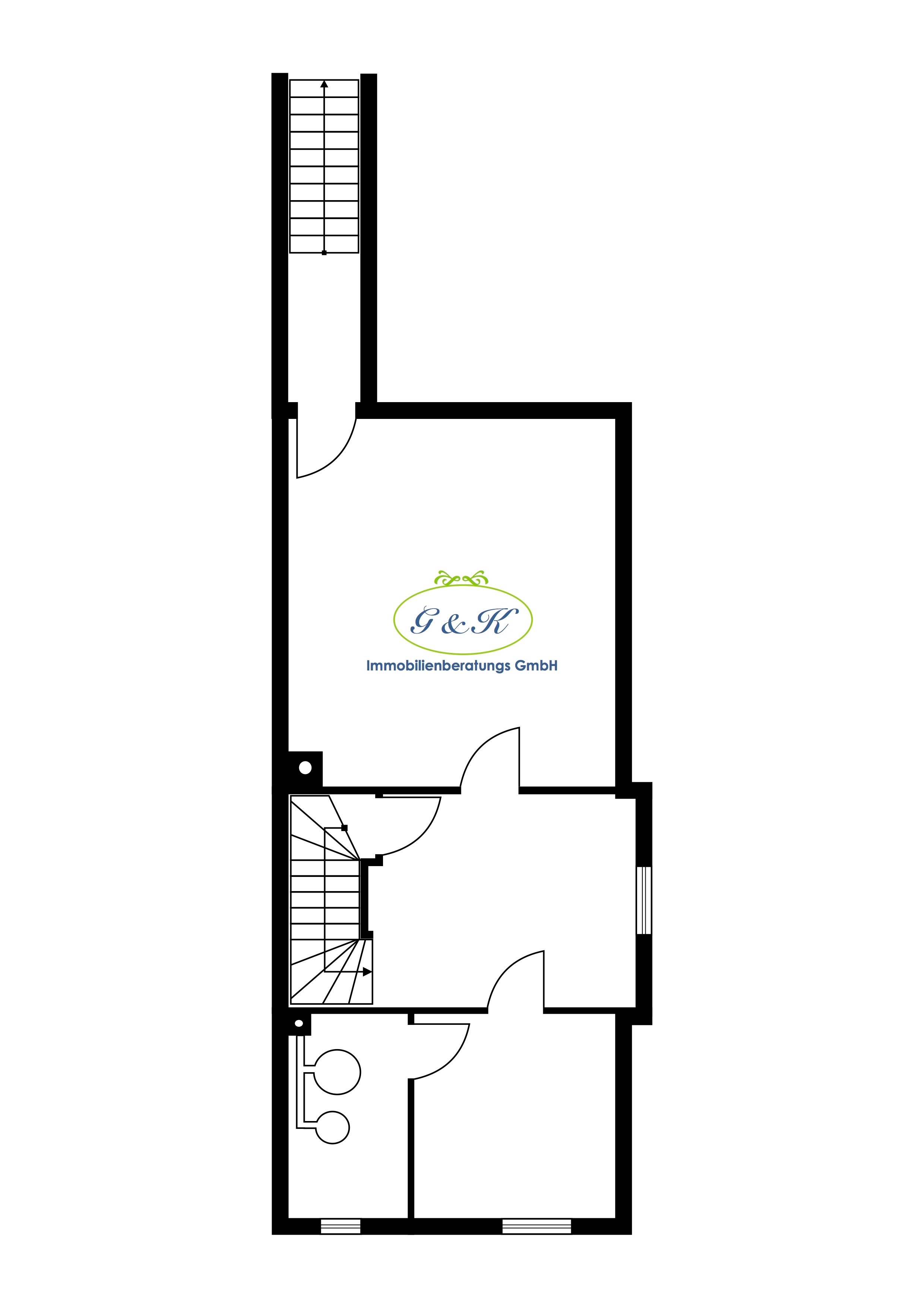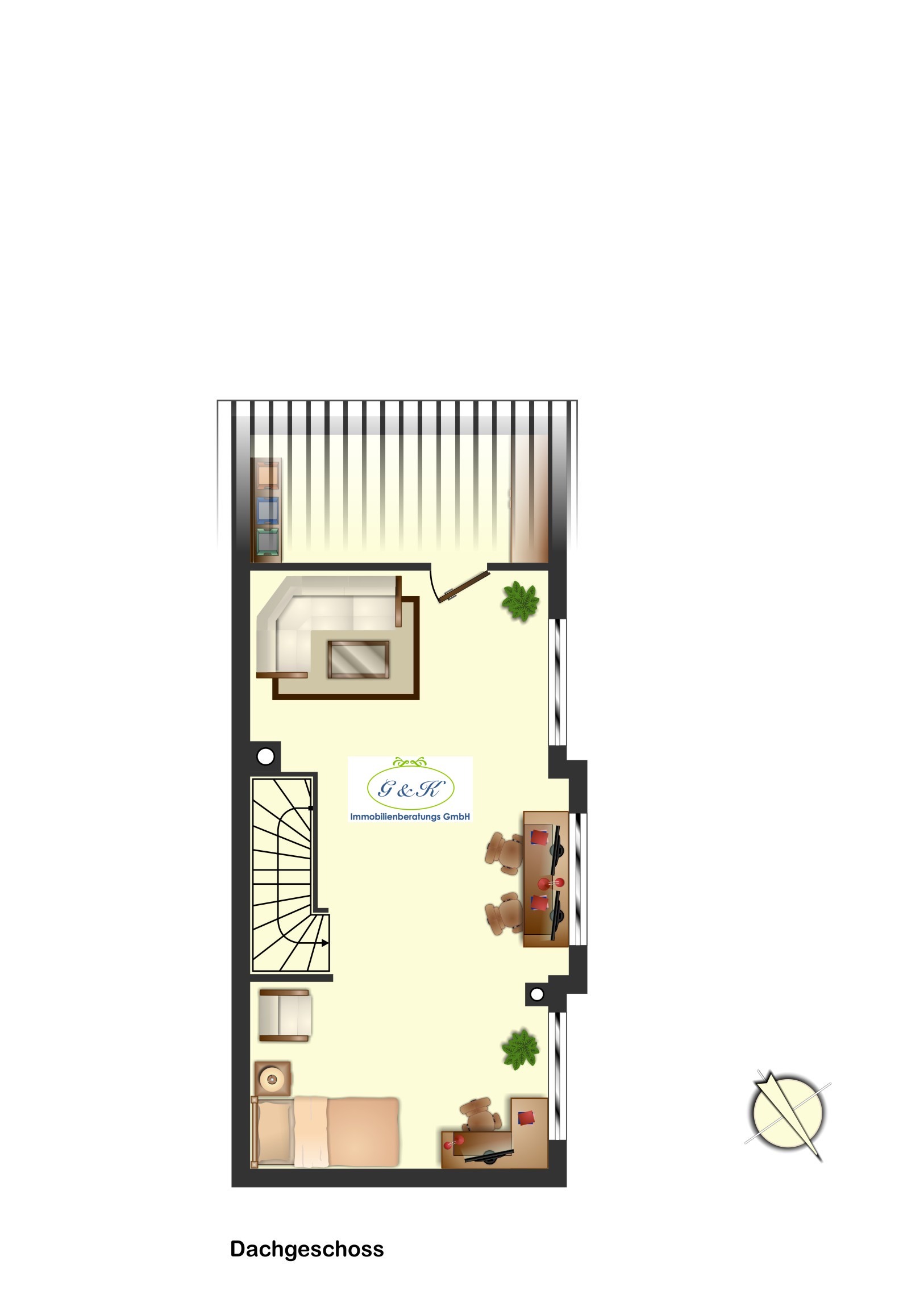 Im Dachgeschoss empfängt Sie ein durch große Fensterflächen maximal ausgeleuchtetes Studio, hell und freundlich.